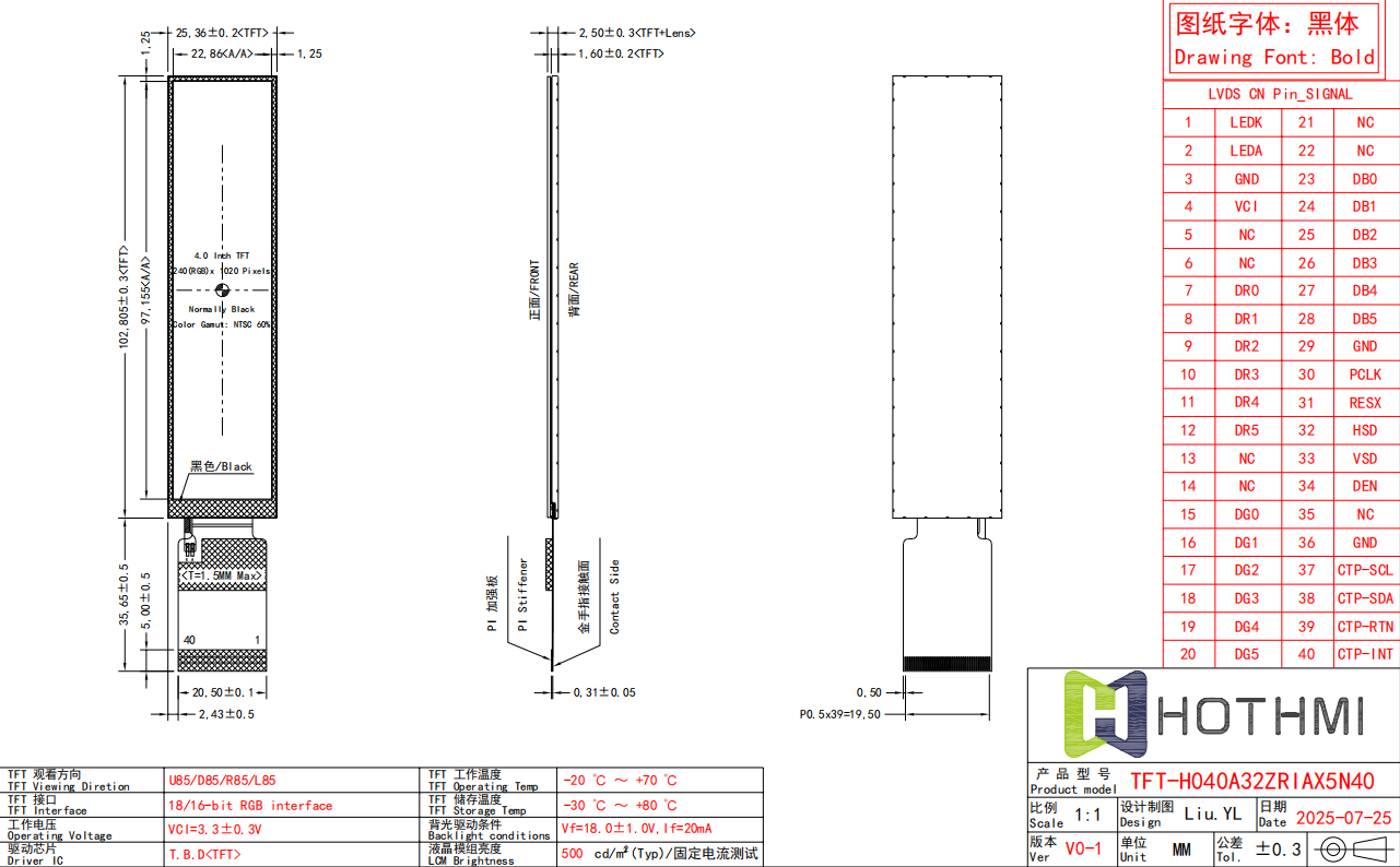 25.36x102.805x2.5 | 4.0 | 4.0 | 22.86x97.155 | IPS全視角 | 500cd/m2 | 40 PIN | RGB | 防靜電ESD 8KV | -20~70℃ | +3.3 V | ||