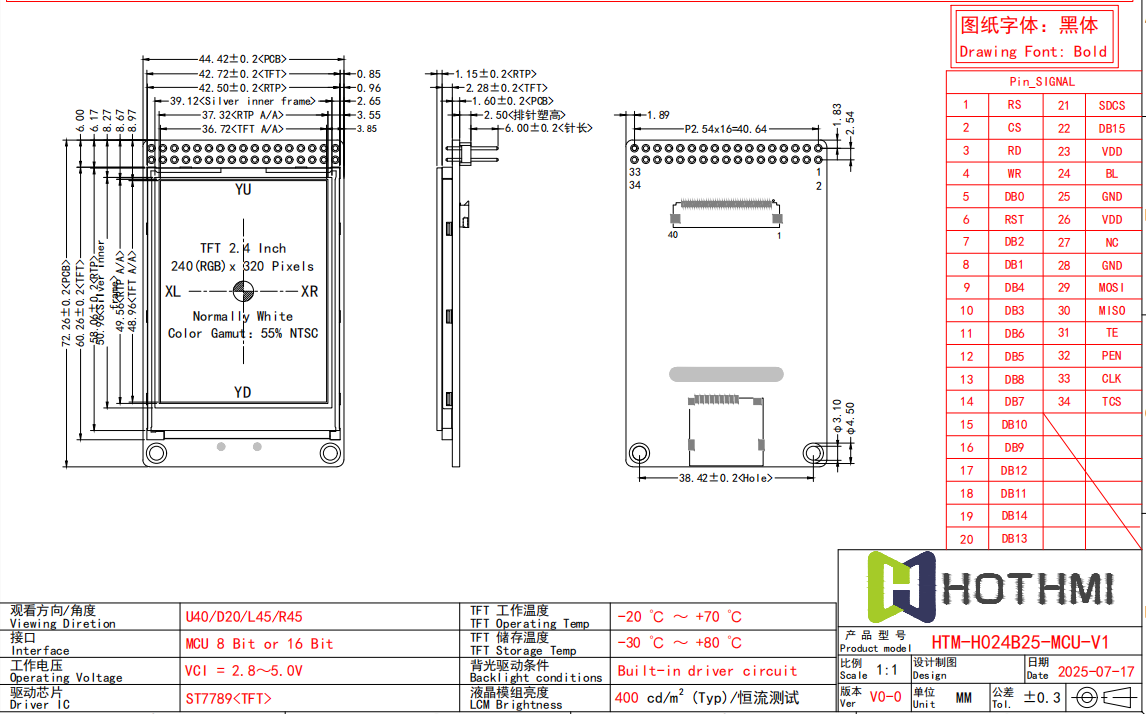 | 2.4寸TFT模塊|240X320分辨率|MCU SPI-4L接口|內(nèi)置ST7789V IC|HTM-TFT024A16-SPI | SPI-TFT | 240x320 |